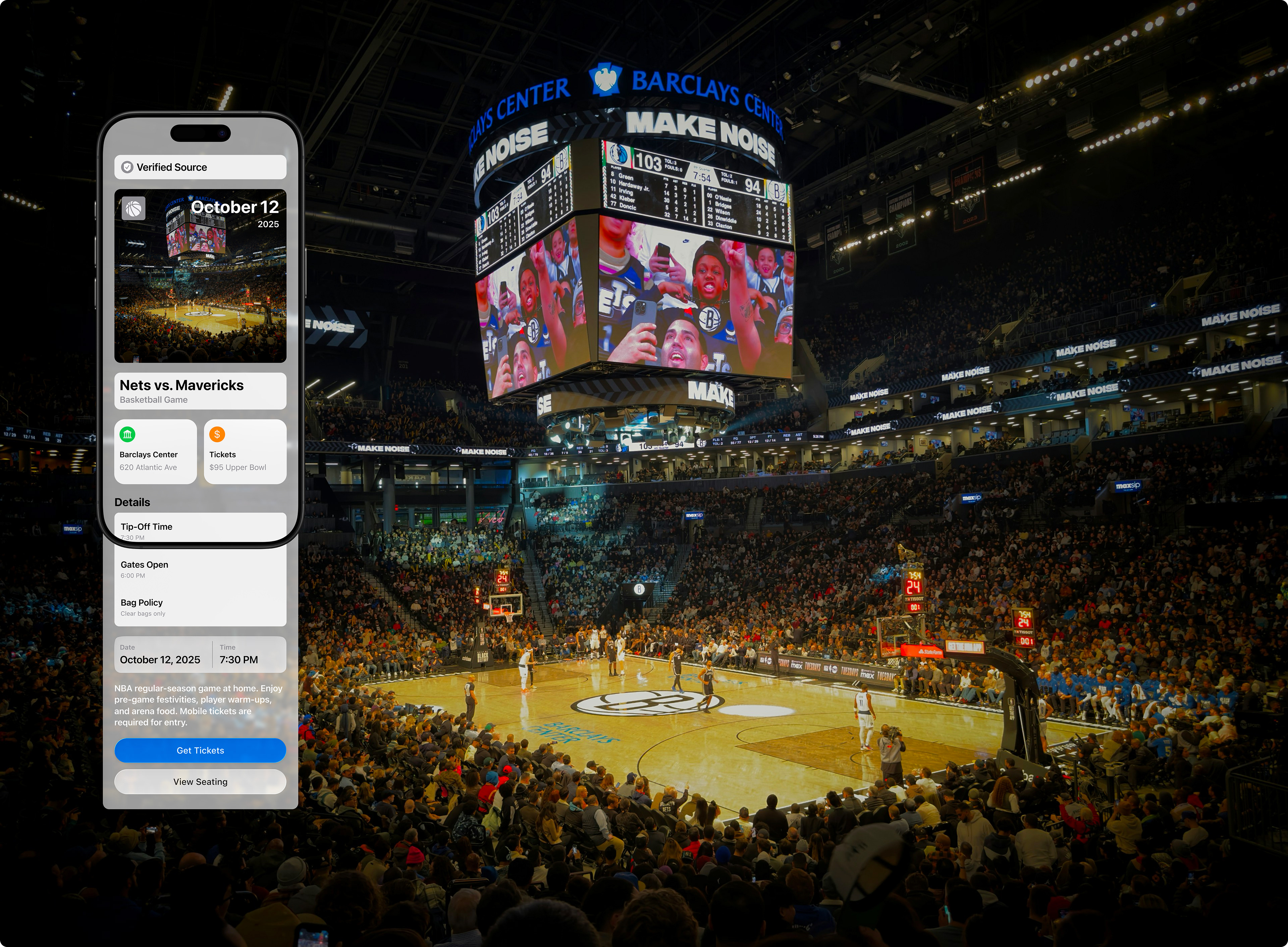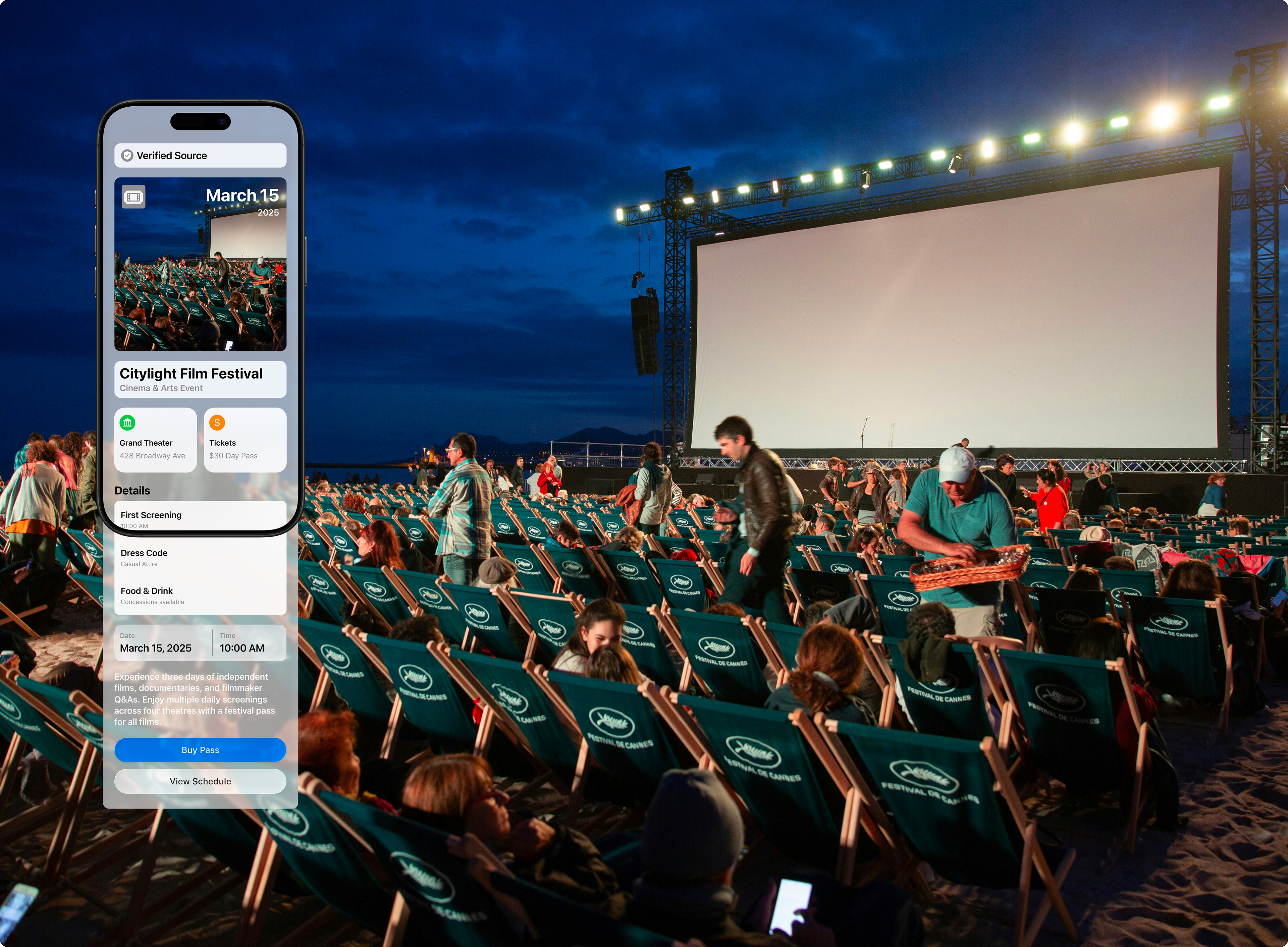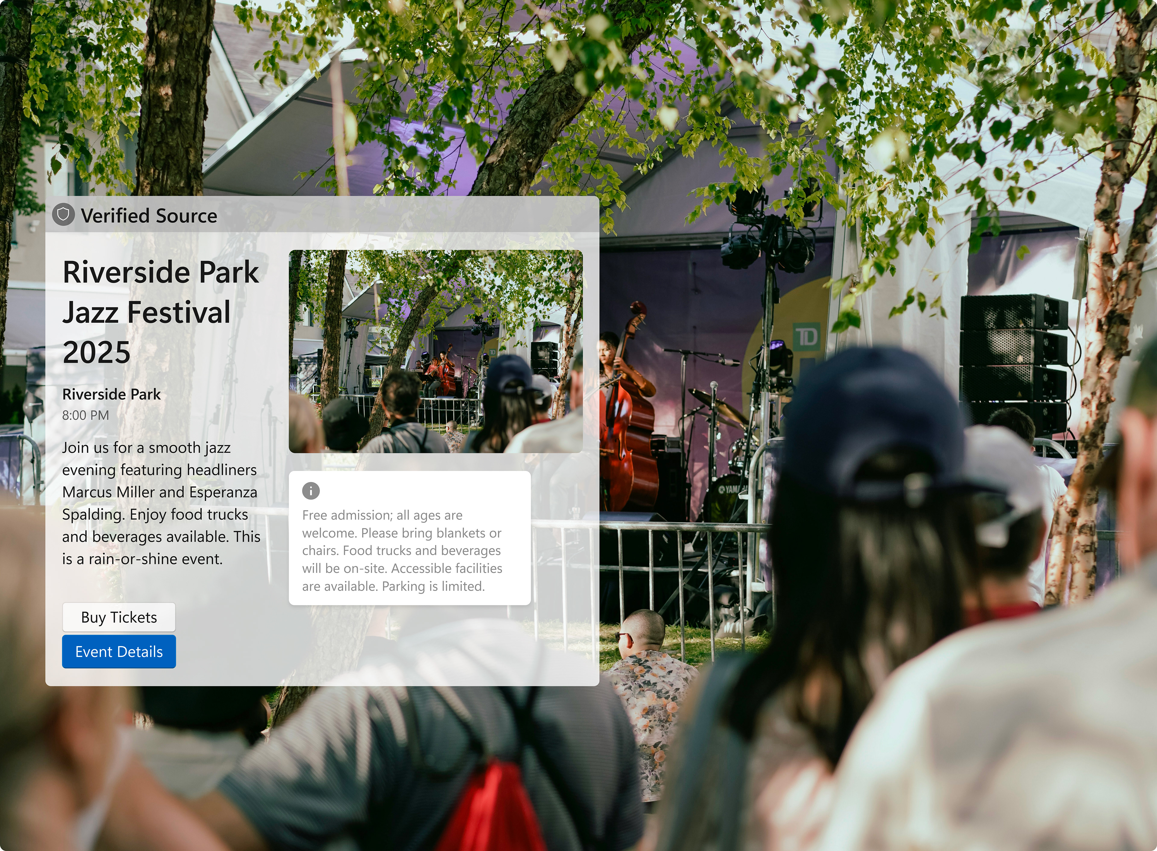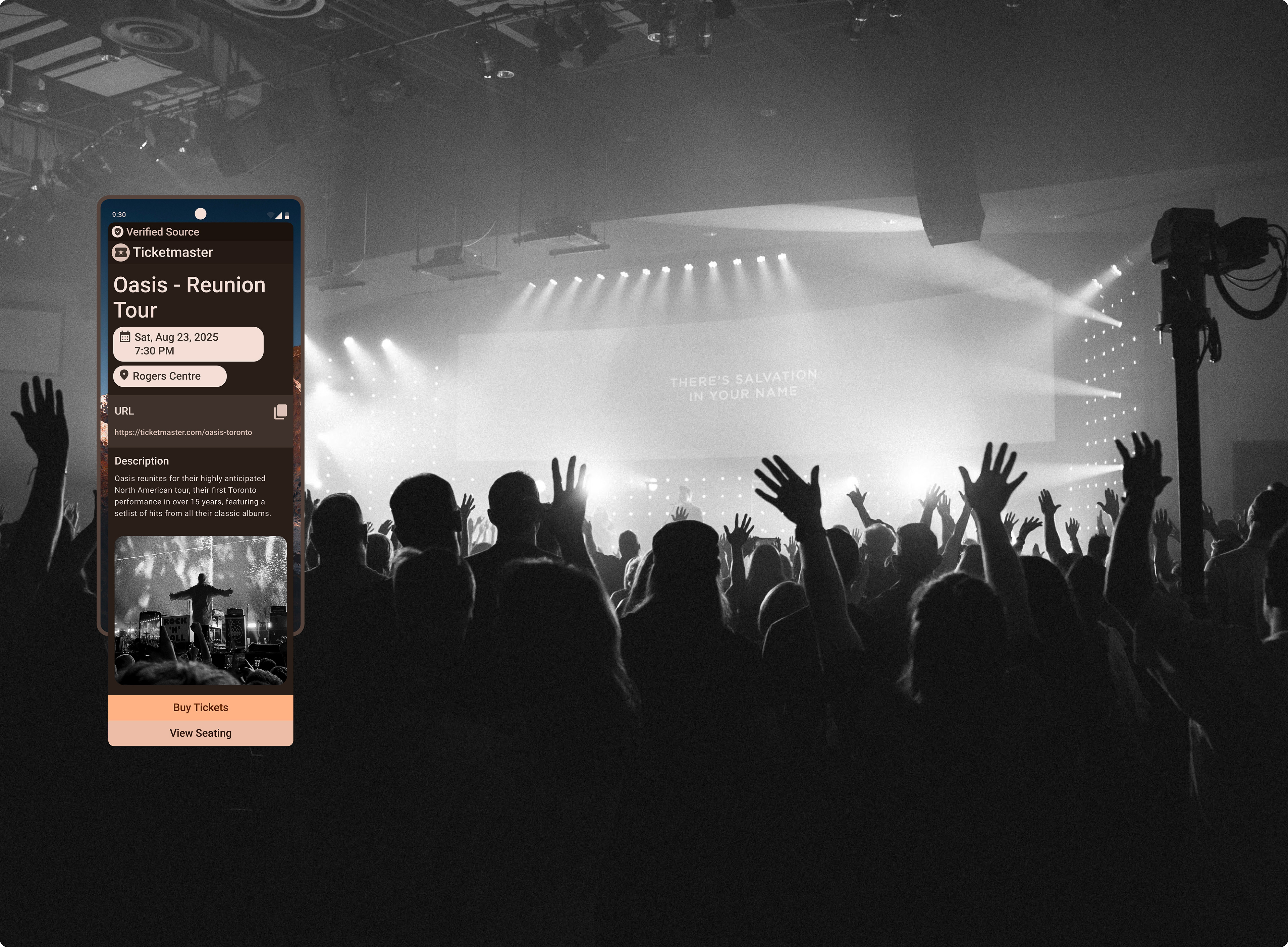 A concert-goer scans a poster downtown. The preview immediately shows the event name, date, venue, and ticket price range, allowing them to decide whether to proceed to ticketing without leaving their current app.