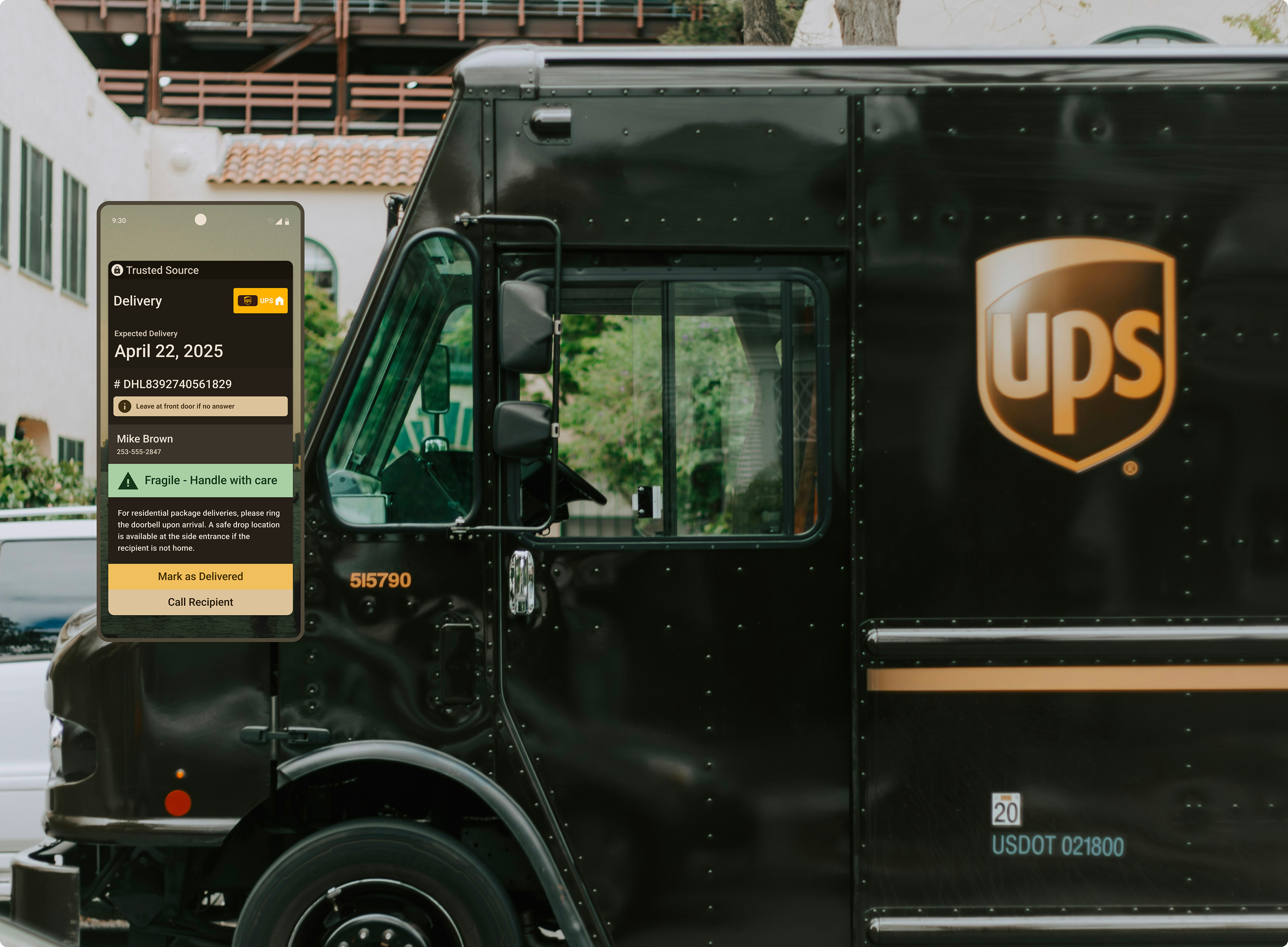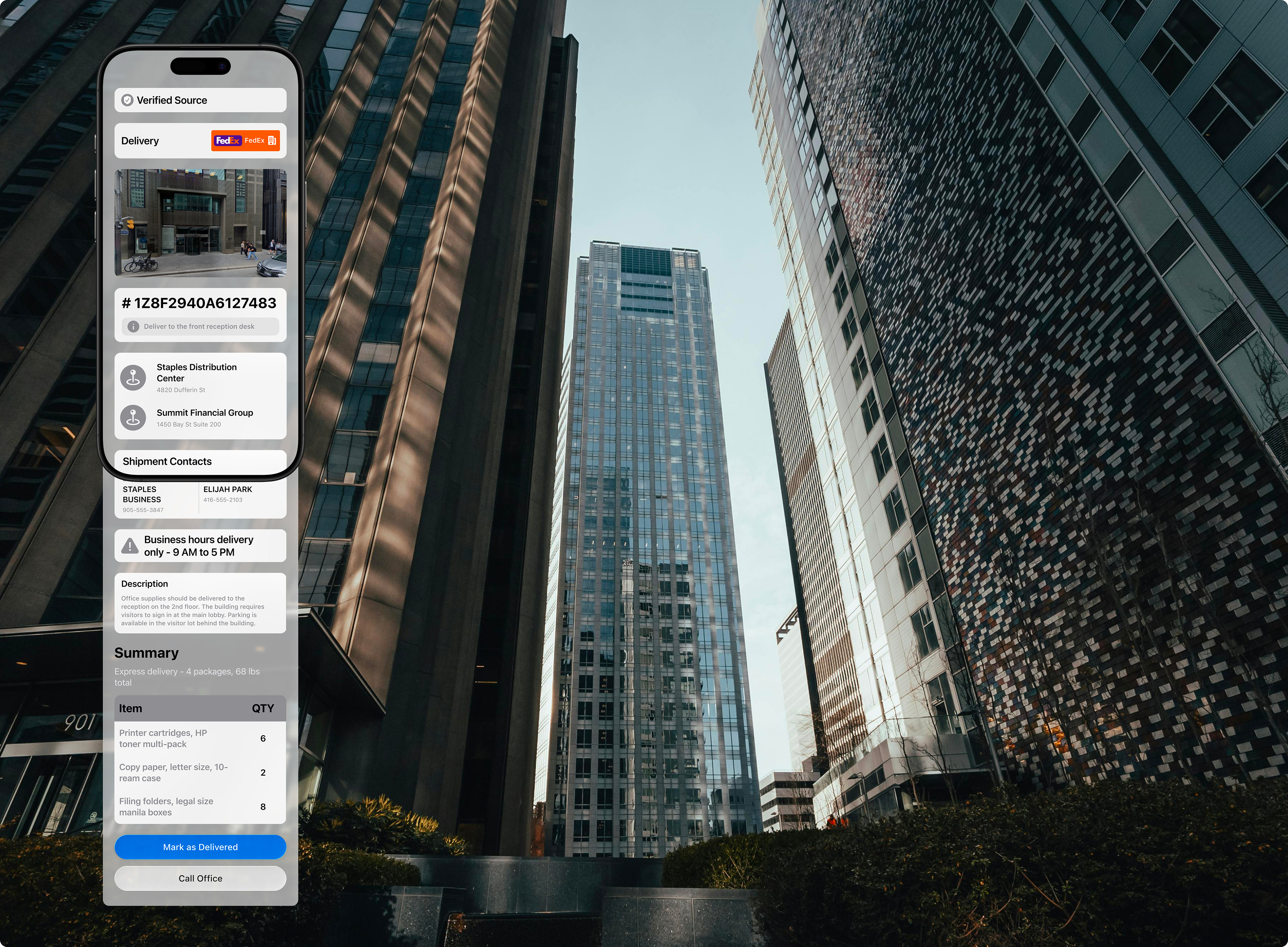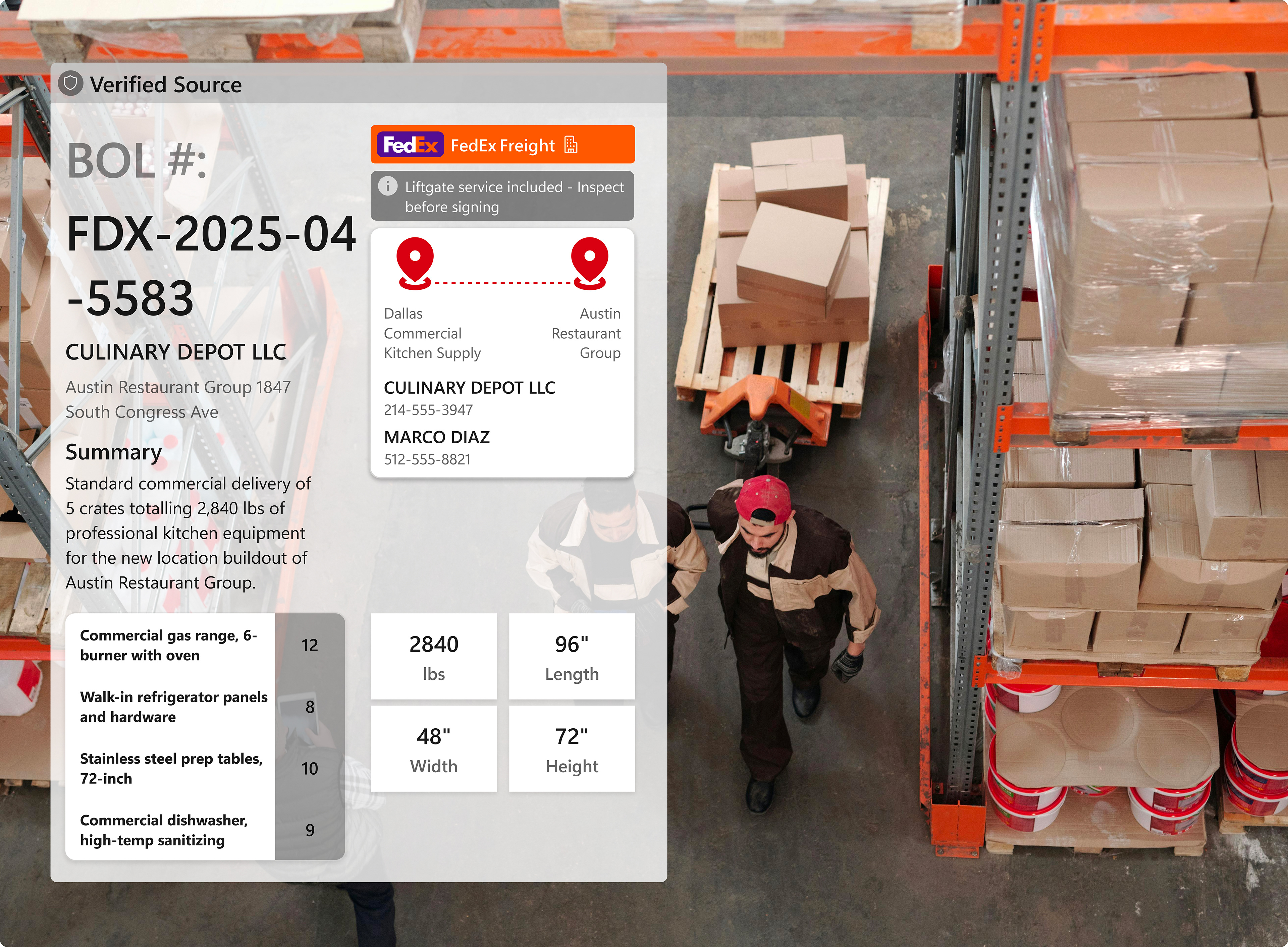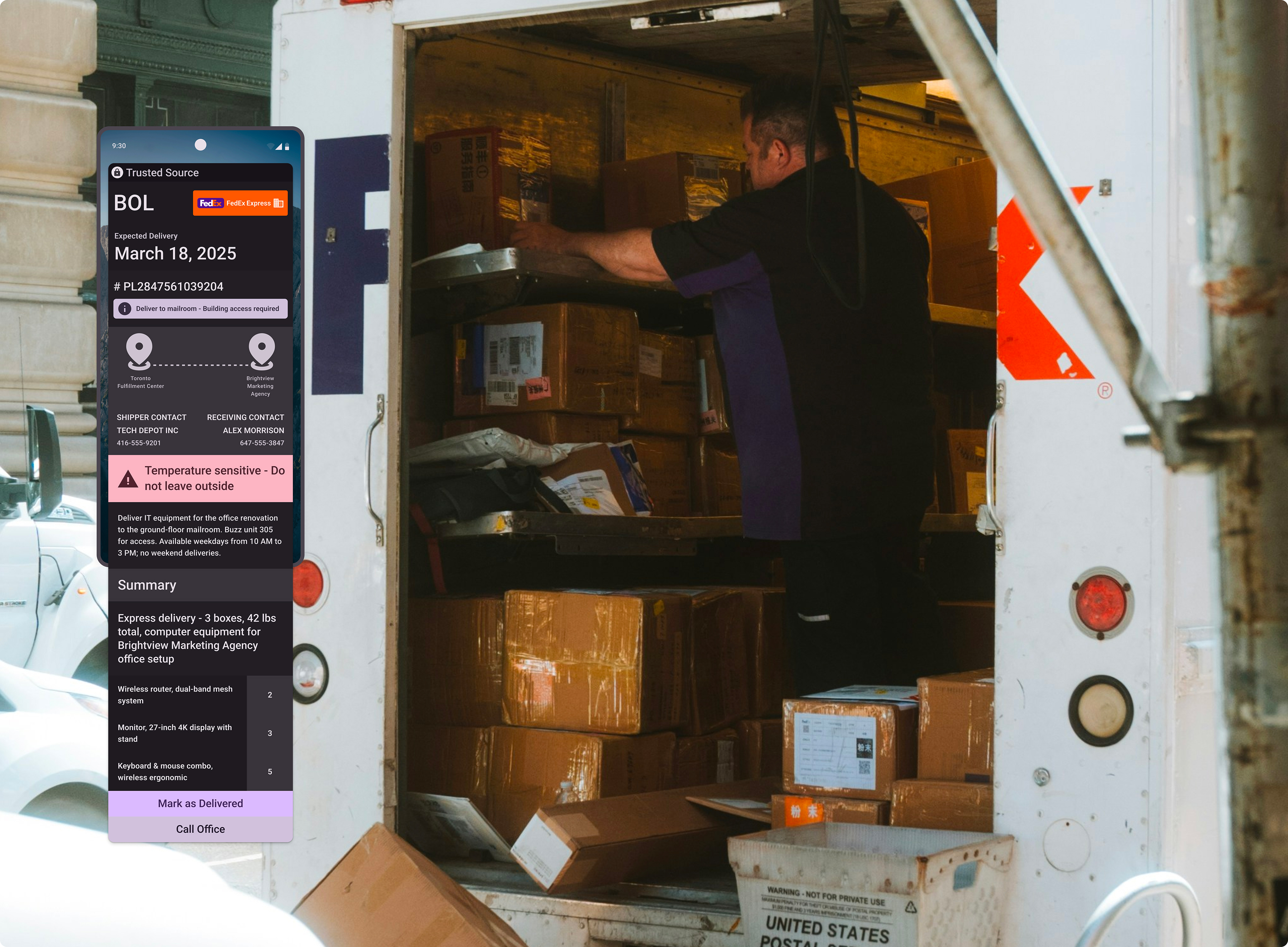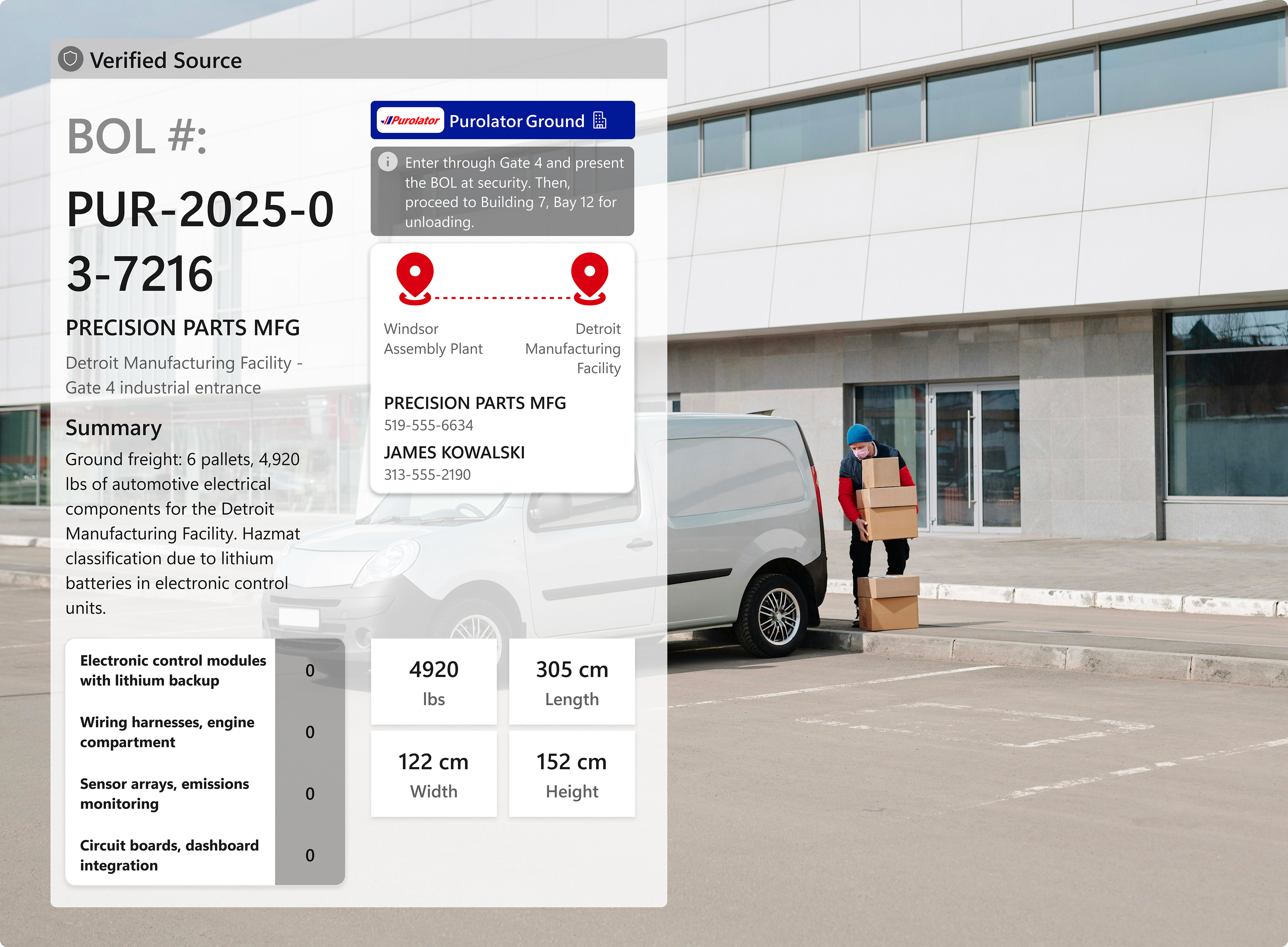 A warehouse worker scans a BOL code. Progressive disclosure first shows the tracking status, with the option to expand for full manifest details, including dimensions, contacts, and itemized contents. This approach provides precisely the information needed without unnecessary navigation.