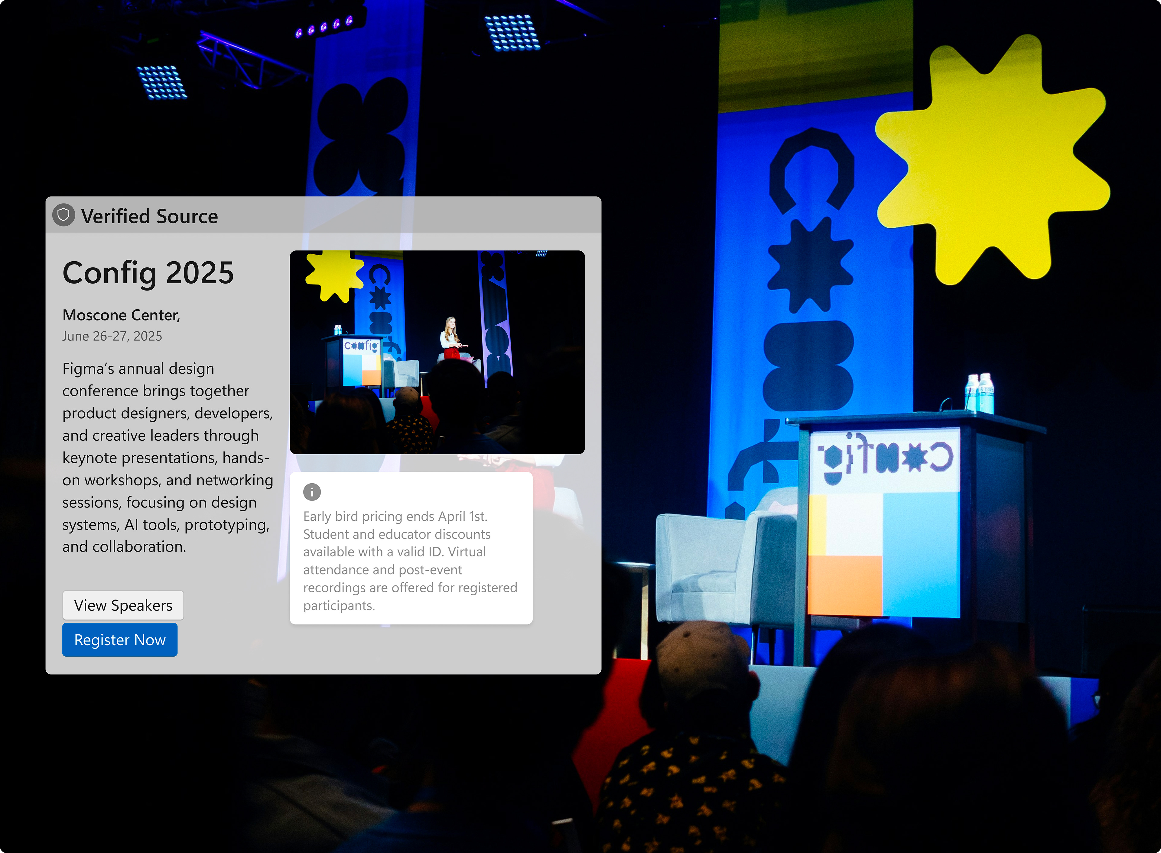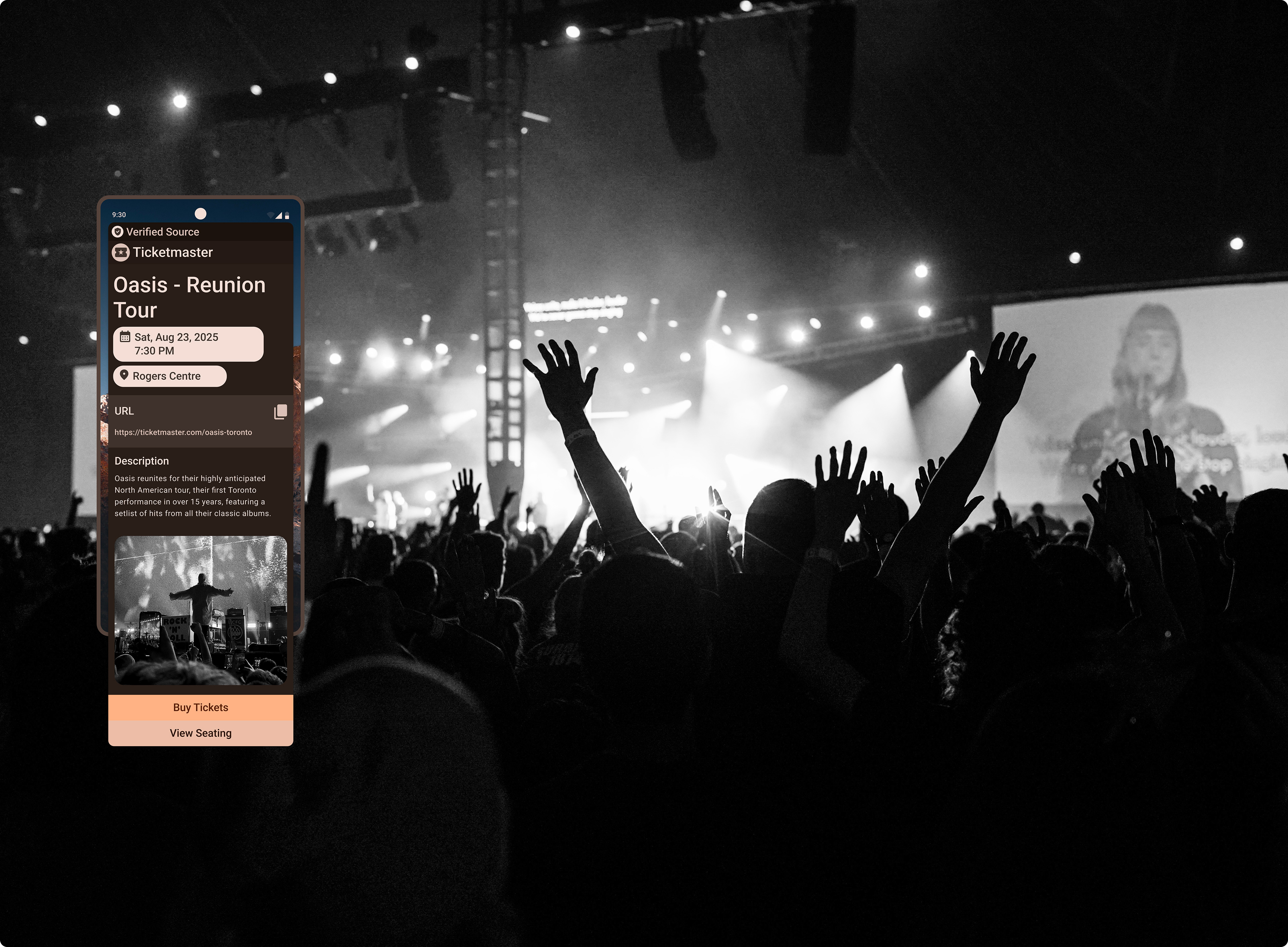 An event-goer scans a poster downtown. The preview immediately shows the event name, date, venue, and ticket price range, allowing them to decide whether to proceed to ticketing without leaving their current app.